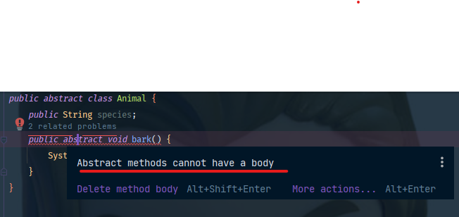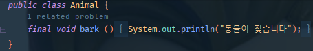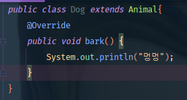 메서드 오버라이딩의 예제는 위의 bark()를 재정의한 코드를 참고하길 바란다.