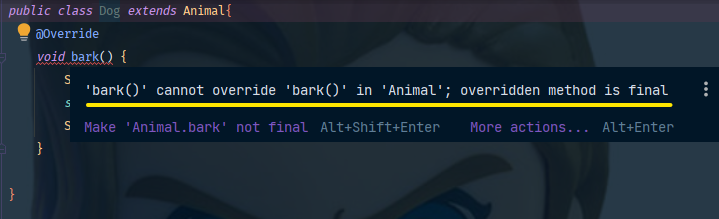 메서드에 final 키워드를 붙이게 되면 해당 메서드는 최종적인 메서드란 의미가 되므로 오버라이딩이 불가