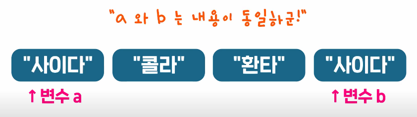서로 다른 변수가 메모리 상의 같은 객체를 가리킬 때만 동일하다고 판단하는 것